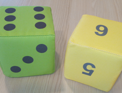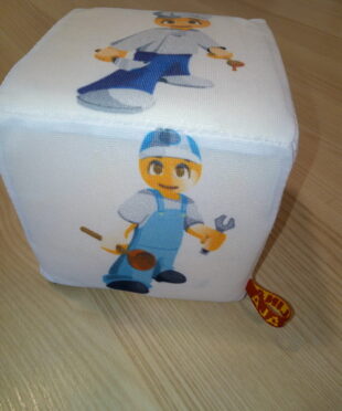 Kocke so primerne za igro in prvo spoznavanje barv, števil, poklicev, črk. Na voljo različni motivi potiska (številke, črke, gibanje, poklici). V kompletu so 4 kocke dimenzije 12x12x12cm.