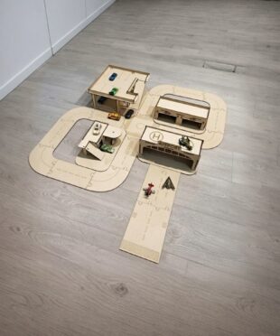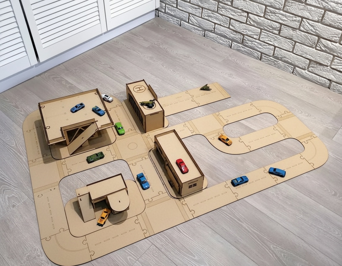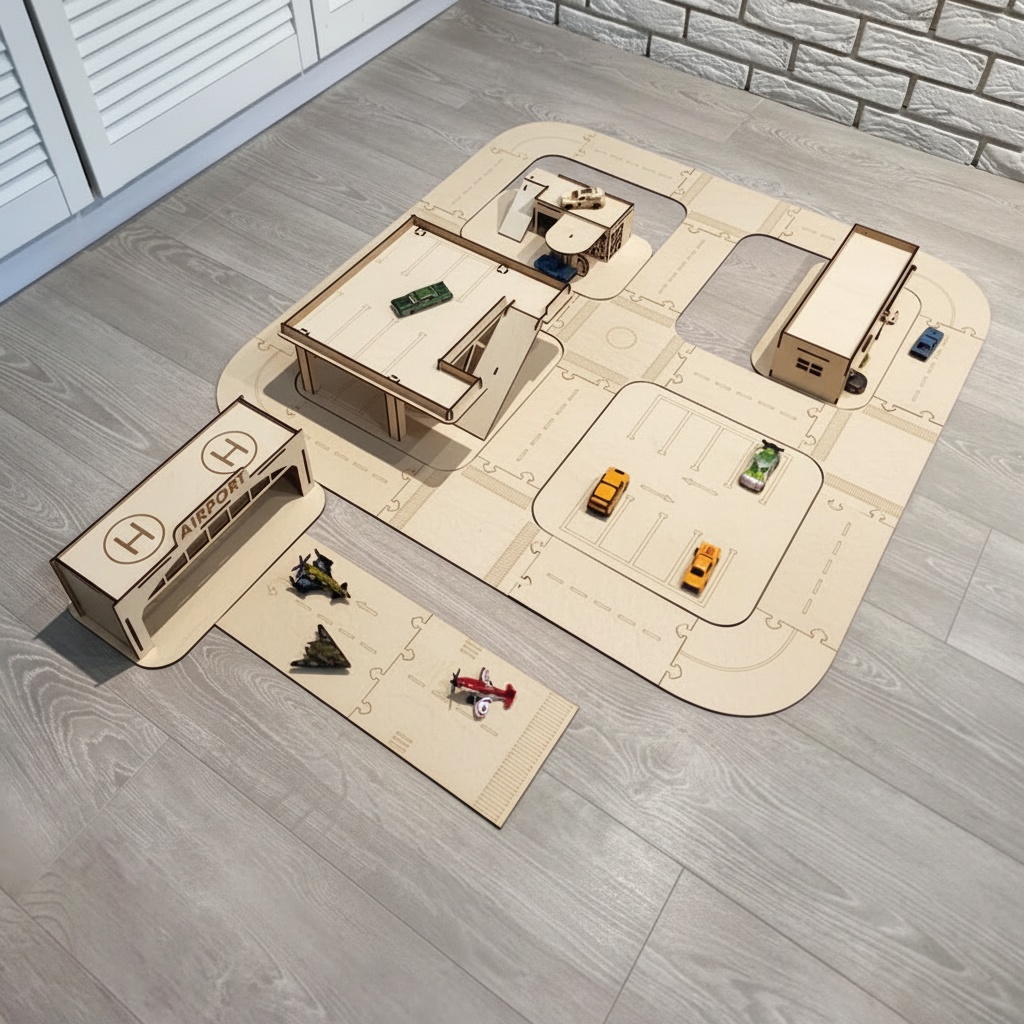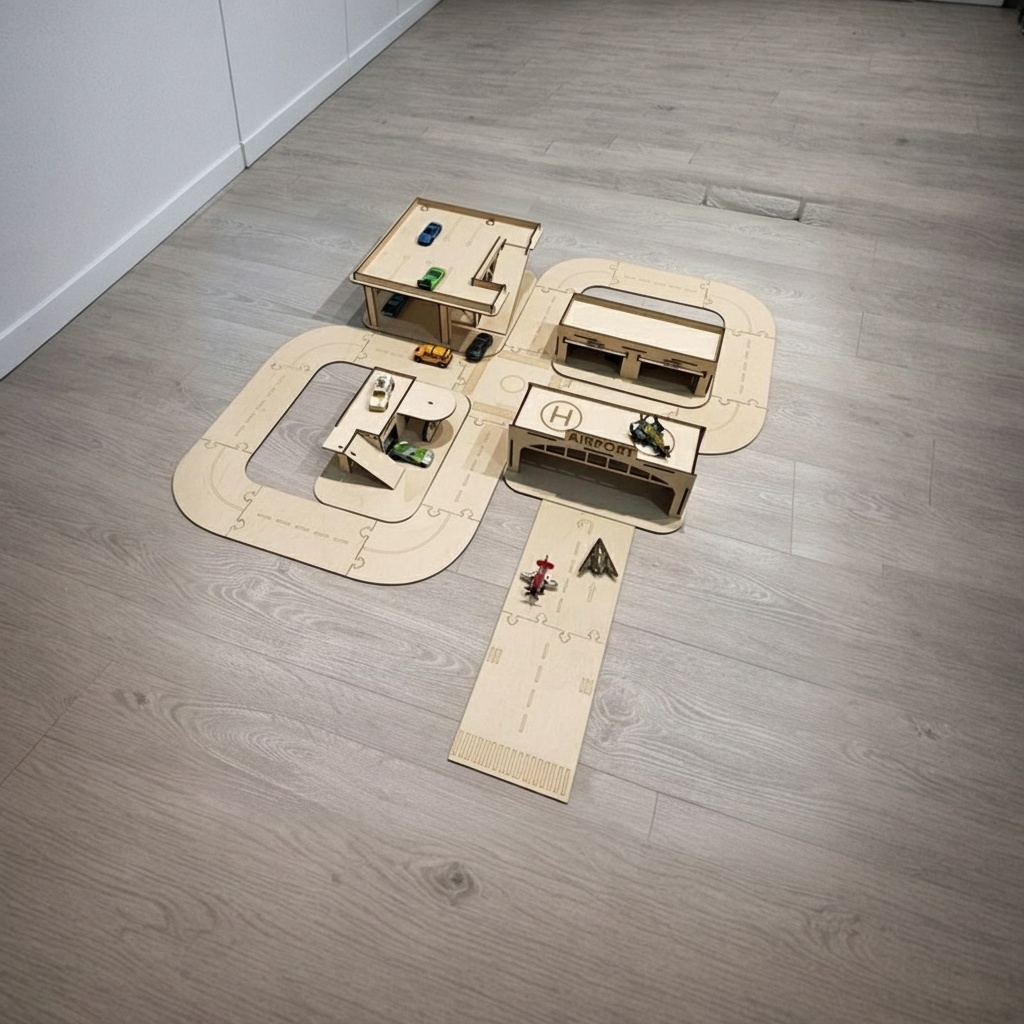 Ta lesena sestavljanka s cestami in stavbami ponuja otrokom ustvarjalen in interaktiven način gradnje lastnega miniaturnega mesta. Kosi sestavljanke se prepletajo in tvorijo ceste, razporejene v različne postavitve, skupaj s podrobnimi oznakami, kot so vozni pasovi in križišča. Komplet vključuje lesene modele stavb, kot so parkirna hiša, helikopterska ploščad + hangar, bencinska črpalka in parkirna hiša.